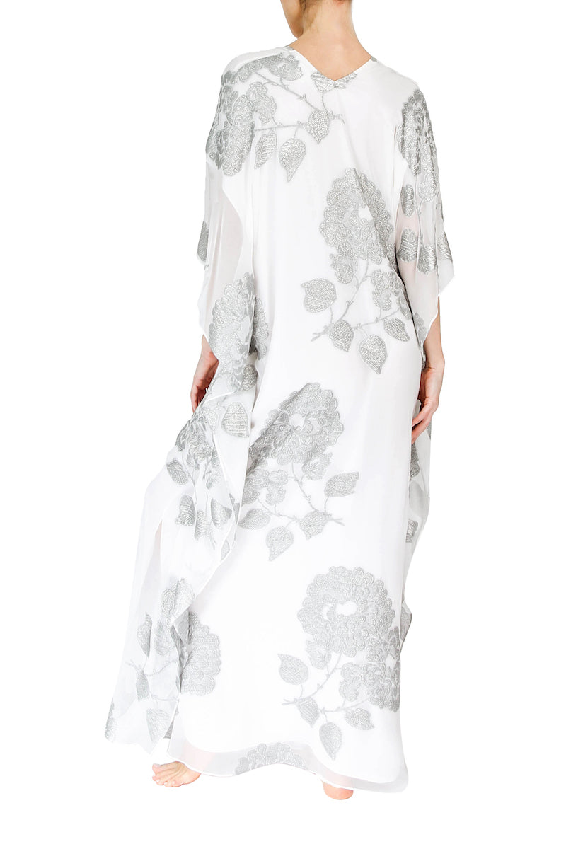 Crafted from the softest slightly crinkle silk chiffon and eye catching jacquard flower details. This stunning caftan will turn some heads!