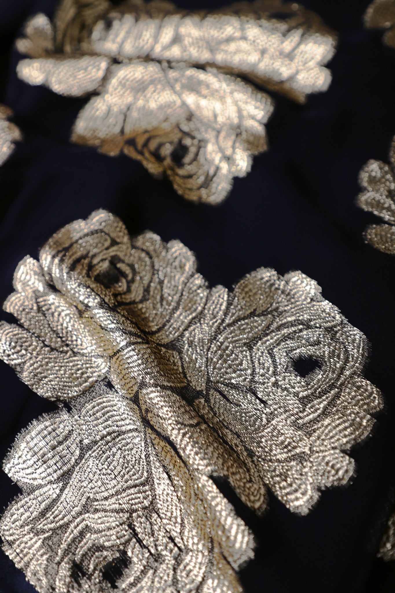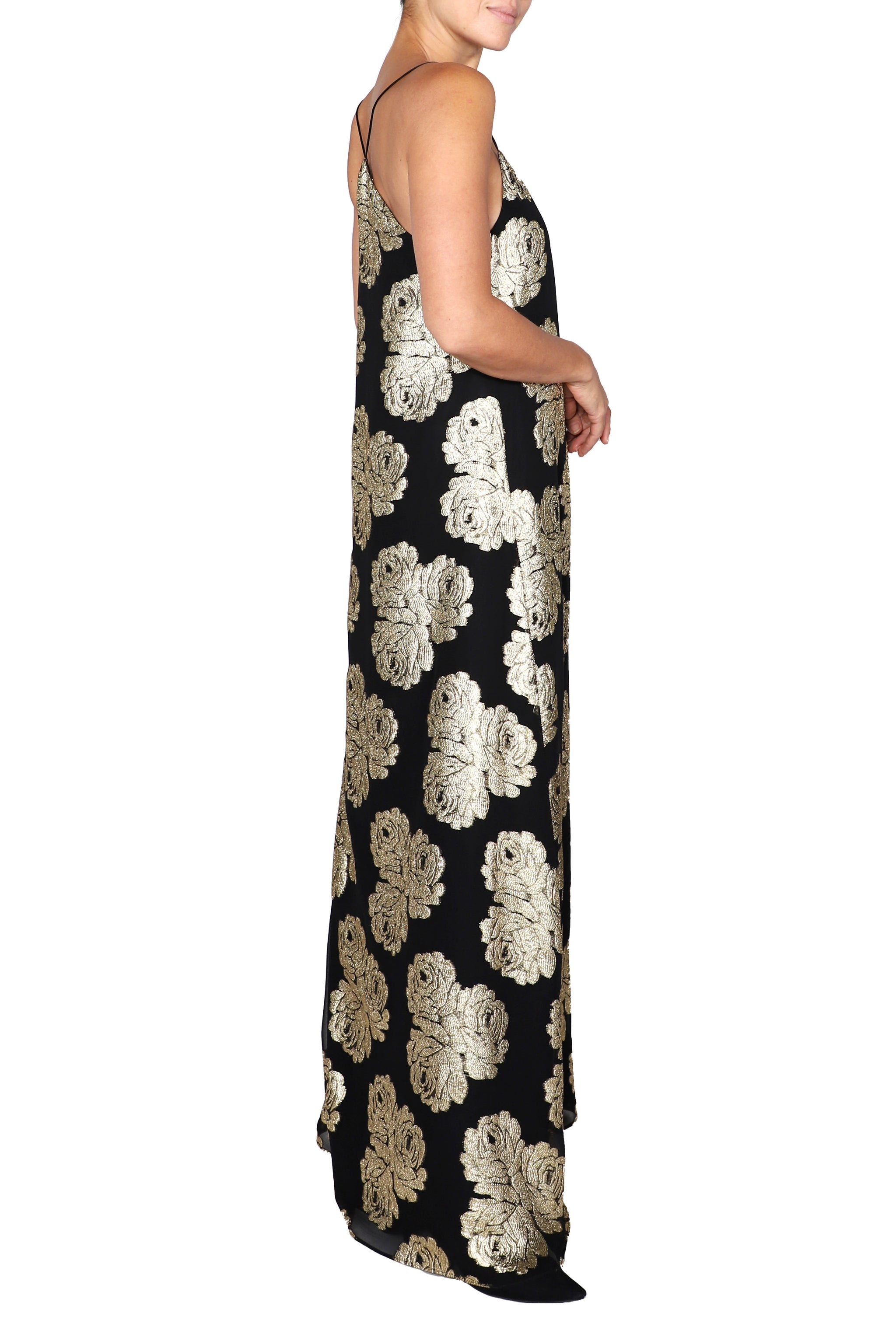 Make a statement by wearing this fabulous racer back dress. Crafted in the softest silk chiffon with luxurious gold metallic thread in rose flowers jacquard details.