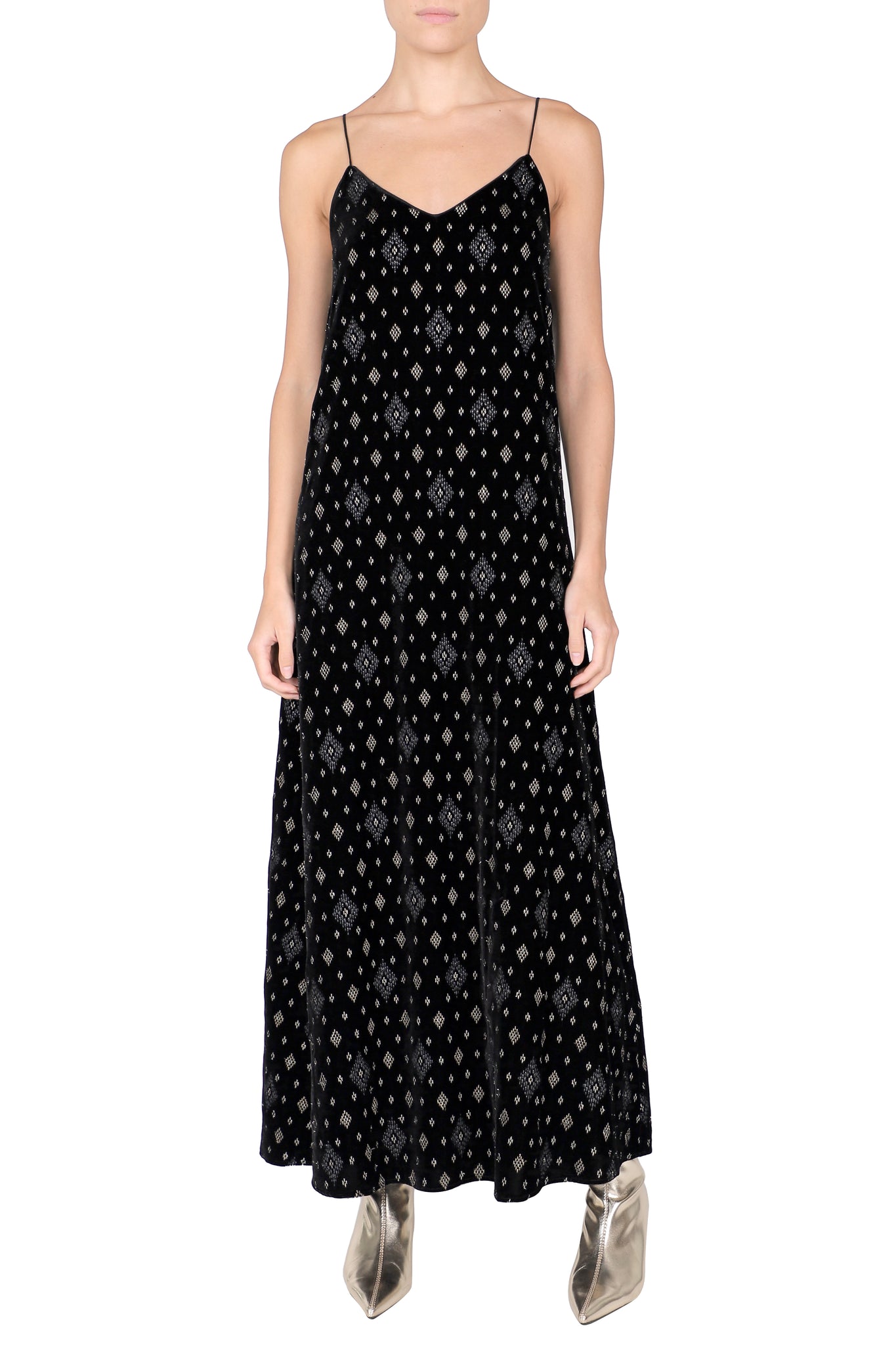 Make a statement by wearing this embroidered cami dress. Crafted in the softest velour with exquisite gold metallic diamond embroideries.